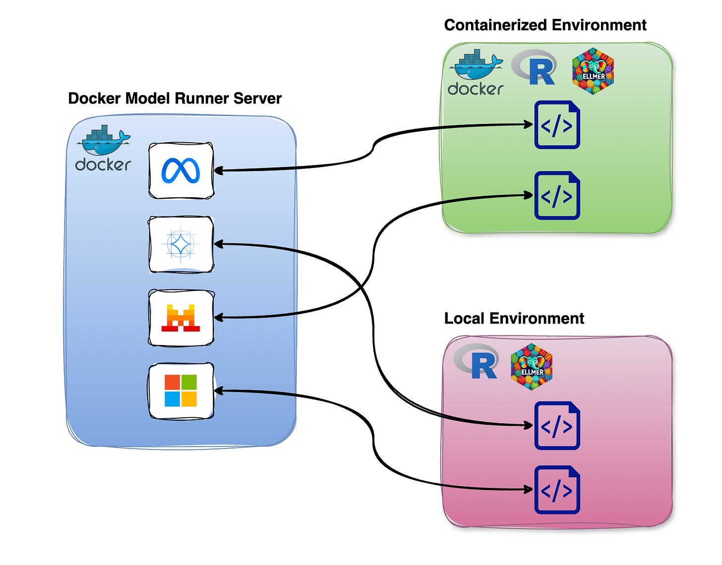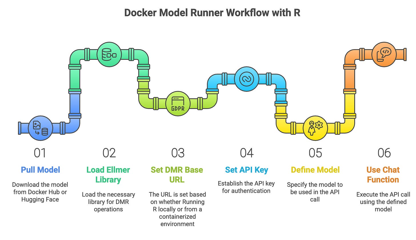 Using Docker Model Runner with R is straightforward, and it follows the same workflow as in Python. The DMR’s compatibility with the OpenAI API SDK simplifies and unifies the process of interacting with different LLMs by using the ellmer OpenAI API’s wrapper. This enables us to run LLMs locally and seamlessly with R.
