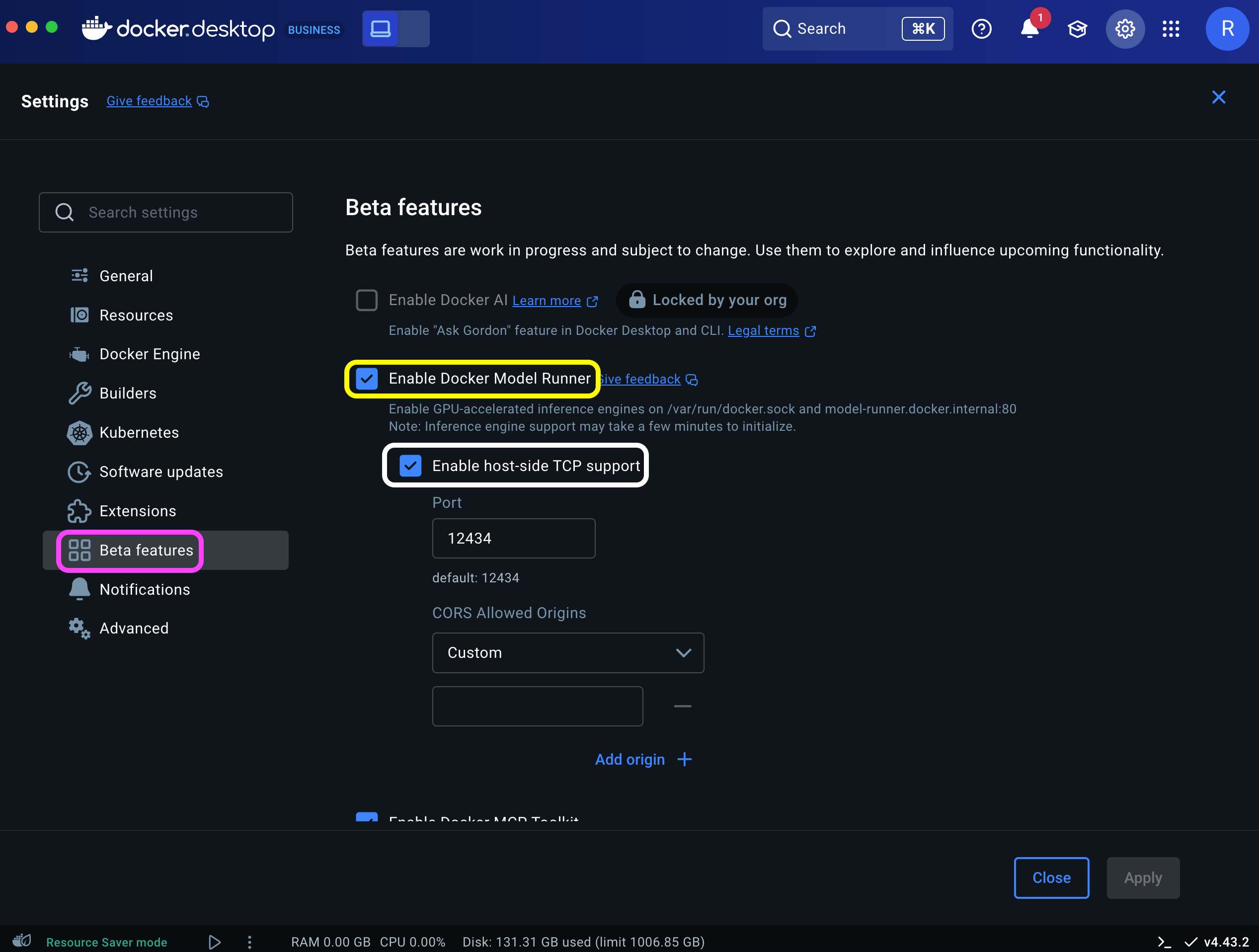 The prerequisite for running DMR is Docker Engine (Linux) or Docker Desktop 4.40 and above for MacOS, and Docker Desktop 4.41 for Windows Docker Engine. For hardware requirements, please check the Docker Model Runner documentation