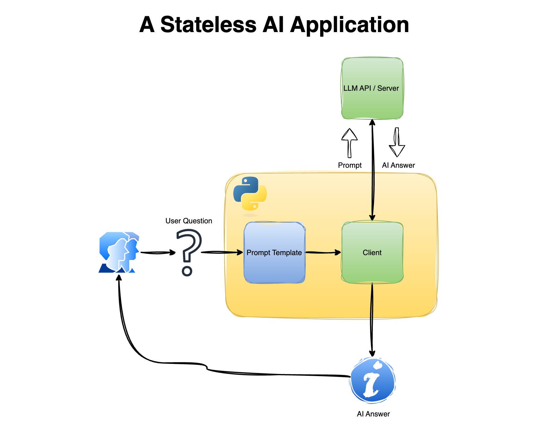 Let’s start by building a simple chat application with no memory (i.e., stateless) and see how it behaves (or fails) when a user tries to have a conversation or follow up on a previous one. This simple application will have the following components: