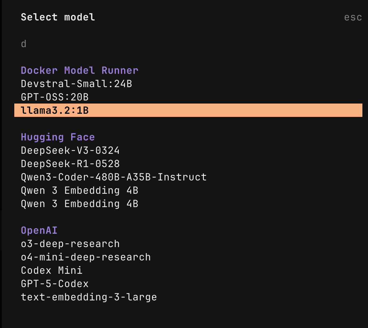 OpenCode doesn’t have a built-in DMR provider, but because DMR is OpenAI-compatible, we can use the OpenAI SDK schema: