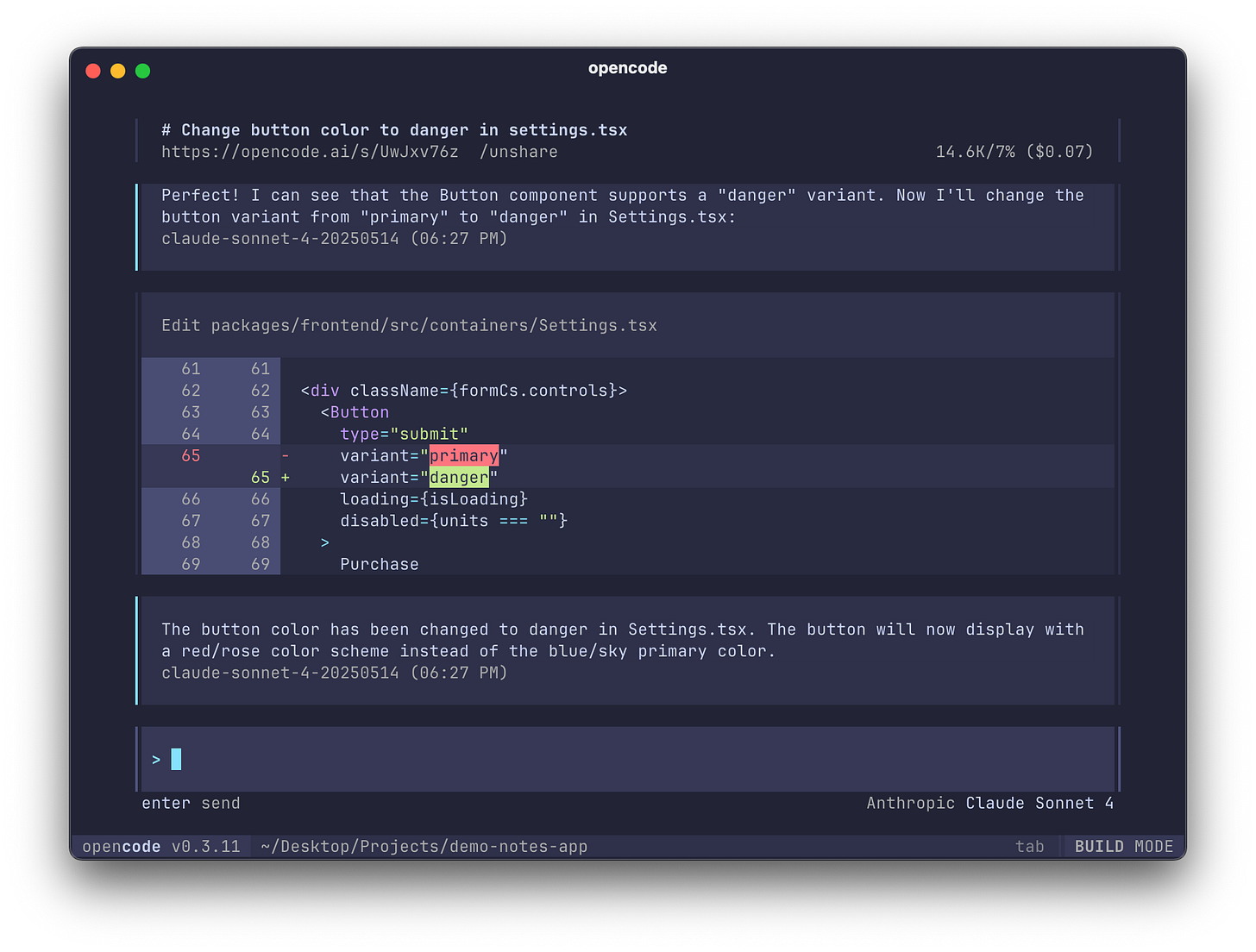 In short, OpenCode is an open-source AI code generation tool, similar to Claude Code. It’s a CLI tool that can connect to popular LLM APIs (like OpenAI, Anthropic, or Gemini) or any API compatible with the OpenAI SDK.